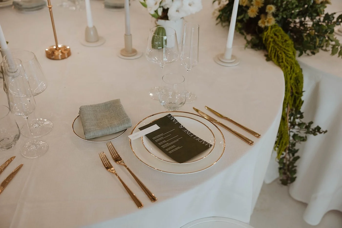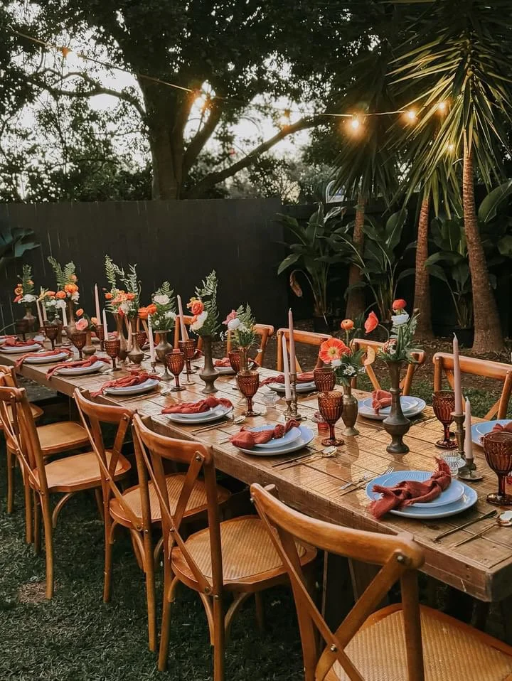 Gold Coast event hire by Stay Golden Event Hire: long dining table with greenery and hanging florals set for formal celebration.