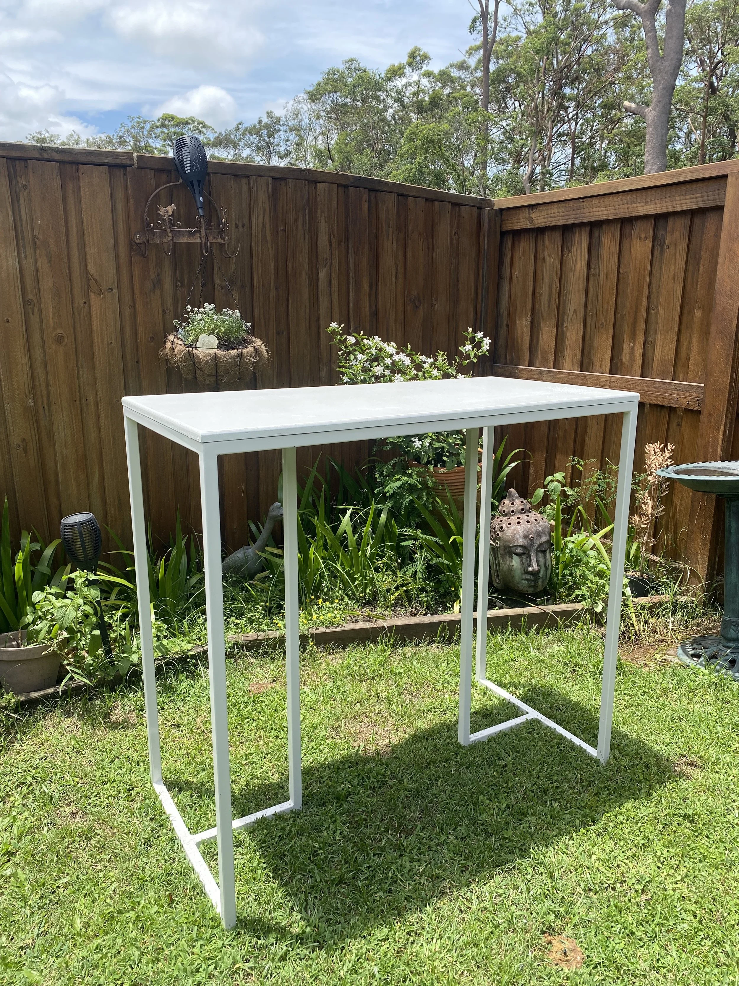 Gold Coast event furniture hire by Stay Golden: high bar tables, stools, string lights and potted plants on patio.